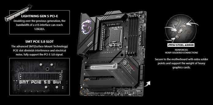 Lighting PCIe Gen 5 MSI MPG Z790 CARBON WIFI với giao diện PCIe 5.0 cho băng thông lên đến 128Gbps nhờ trang bị khe cắm PCI-E SMT (Surface Mount Technology) tiên tiến giúp giảm nhiễu và nhiễu điện, hỗ trợ đầy đủ băng thông cao hơn và tốc độ truyền tín hiệu nhanh hơn |