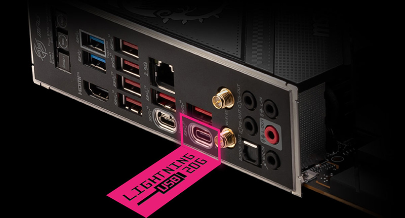 Cổng USB 3.2 Gen 2x2 MSI MPG Z790 CARBON WIFI cung cấp nhiều tuỳ chọn kết nối và tăng tốc các thiết bị USB với tốc độ lên đến 20Gb/s khi sử dụng cổng USB Type-C . |