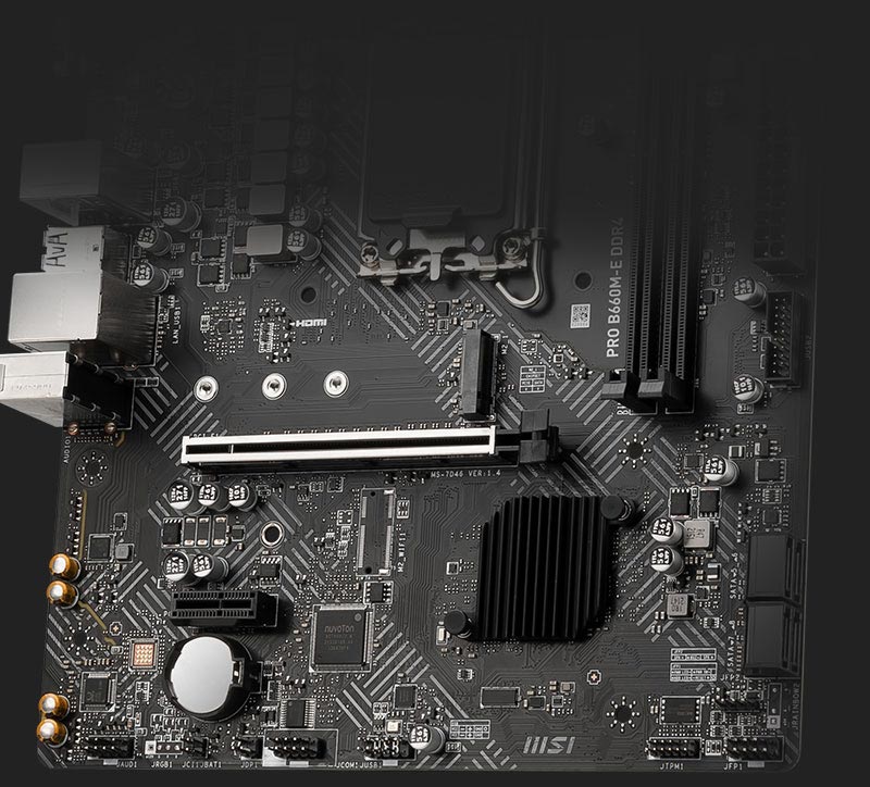 Hỗ trợ M.2 PCIe 4.0 MSI PRO B660M-E DDR4 hỗ trợ khe cắm M.2 PCIe 4.0 và cung cấp hỗ trợ NVMe SSD RAID để tăng hiệu suất đáng kinh ngạc. Tạo cấu hình RAID với thiết bị lưu trữ PCIe để tận hưởng tốc độ truyền dữ liệu nhanh nhất. |