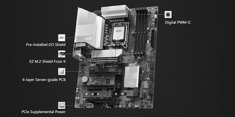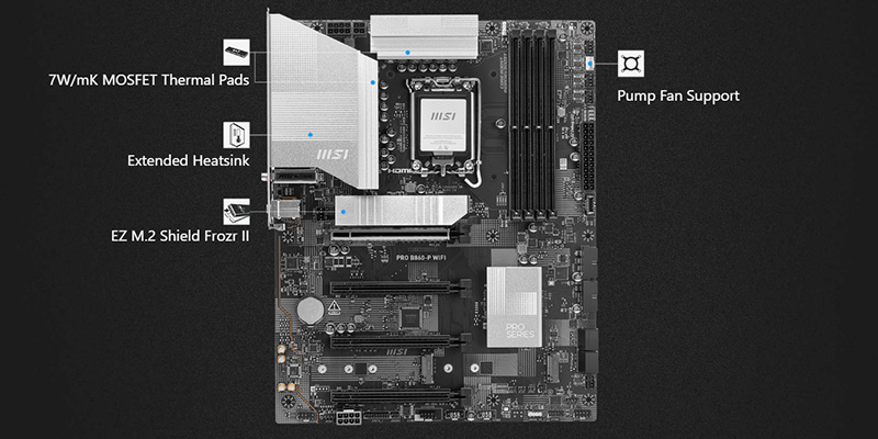 Với thiết kế VRM 12+1+1+1 pha điện số, MSI PRO B860-P đảm bảo cung cấp nguồn điện ổn định và mạnh mẽ cho CPU, giúp hệ thống hoạt động mượt mà ngay cả khi thực hiện các tác vụ nặng. Hệ thống tản nhiệt mở rộng cùng miếng đệm nhiệt MOSFET với độ dẫn nhiệt 7W/mK giúp duy trì nhiệt độ lý tưởng cho bo mạch chủ.
