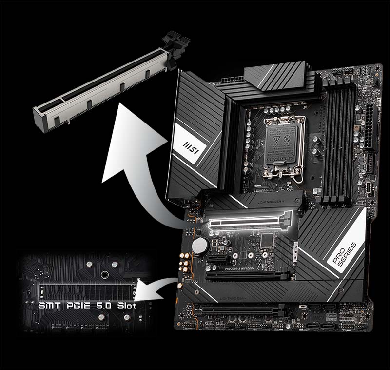 MSI Lightning Gen 5 PCI-E MSI Lightning Gen 5 PCI-E x16 mang đến tốc độ vượt trội lên đến 128GB/s, gấp đôi tốc độ của thế hệ trước, giúp giảm nhiễu, hỗ trợ băng thông và tốc độ truyền tín hiệu PCI-E 5.0. |