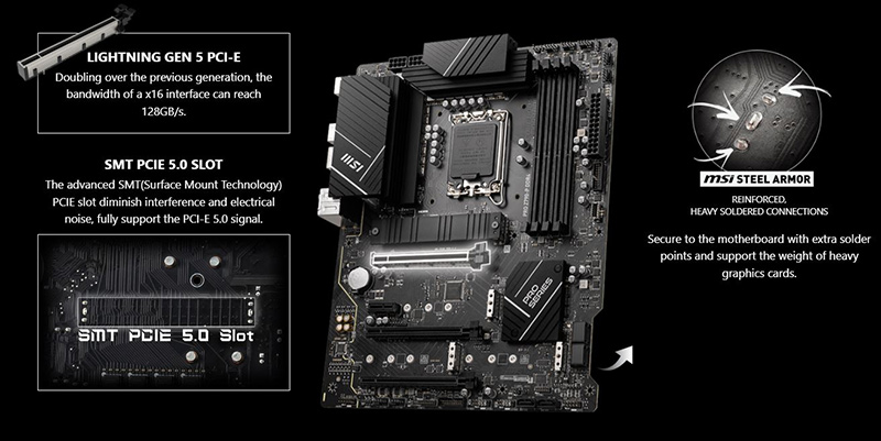 MSI Lightning Gen 5 PCI-E MSI Lightning Gen 5 PCI-E x16 mang đến tốc độ vượt trội lên đến 128GB/s, gấp đôi tốc độ của thế hệ trước, giúp giảm nhiễu, hỗ trợ băng thông và tốc độ truyền tín hiệu PCI-E 5.0. |