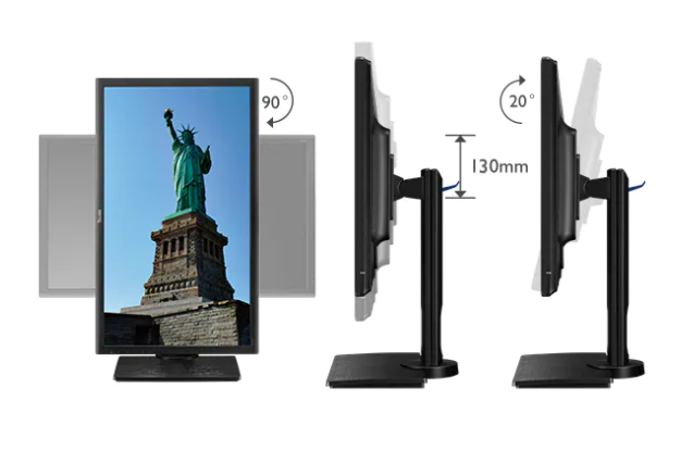 Thiết kế công thái học Phạm vi điều chỉnh đa dạng về độ cao, độ nghiêng, và độ xoay giúp tùy chỉnh nơi làm việc của bạn để hoàn toàn phù hợp với nhu cầu của bạn. Khi được sử dụng ở chế độ màn hình dọc. |