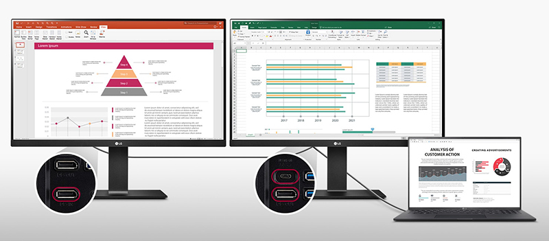 Daisy Chain Màn hình 2K LG 24 Inch 24QP750-B có hỗ trợ Daisy Chain, nâng cao hiệu suất làm việc với kết nối 2 màn hình LG QHD và laptop bằng DP và USC-C. |