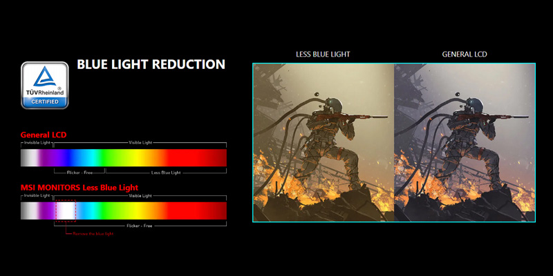 Màn hình 2K MSI G274QPF E2 được tối ưu hóa để giảm ánh sáng xanh, cho phép bạn chơi game trong thời gian dài mà không bị mỏi mắt.