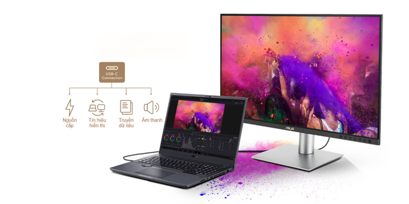 Cổng USB-C đi kèm cho phép truyền dữ liệu siêu nhanh, kết nối DisplayPort và hỗ trợ sạc Power Delivery đến 96 watt để cung cấp nguồn điện cho laptop và các thiết bị khác - tất cả thông qua một cáp duy nhất. Màn hình 4K ProArt PA329CRV cũng có thể hoạt động như một trạm giao nối USB: bất kỳ thiết bị nào được kết nối vào cổng USB của màn hình đều có thể truy cập vào các thiết bị ngoại vi khác được kết nối.