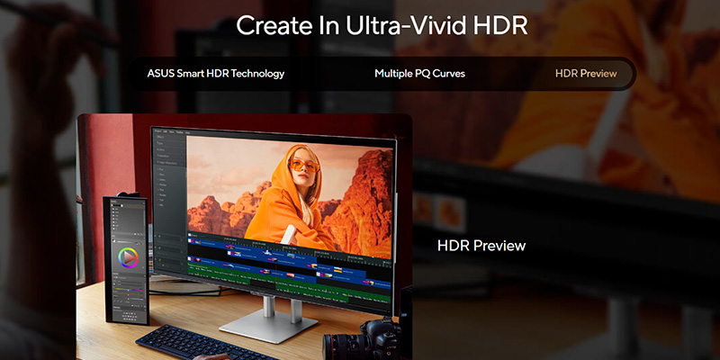 Được chứng nhận VESA DisplayHDR True Black 400, màn hình đạt độ sáng HDR lên đến 1000 nits, độ tương phản lên tới 1.500.000:1, hỗ trợ Dolby Vision, HDR10, và HLG, mang lại khả năng hiển thị sống động, đầy chiều sâu với vùng tối và vùng sáng phân biệt rõ ràng. Tính năng HDR Preview cho phép bạn xem trước hiệu ứng HDR ngay trong phần mềm chỉnh sửa, hỗ trợ workflow chuyên nghiệp.