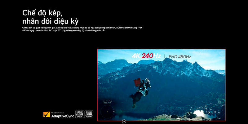 Với Dual Mode, bạn có thể chuyển đổi mượt mà giữa UHD 4K 240Hz và FHD 1080p 480Hz. Tùy vào nhu cầu – ưu tiên độ chi tiết hay khung hình siêu nhanh – người dùng dễ dàng tối ưu hiển thị phù hợp với tựa game hoặc nội dung mình đang sử dụng, giúp vừa chơi eSports mượt mà, vừa sáng tạo với độ phân giải cực cao.