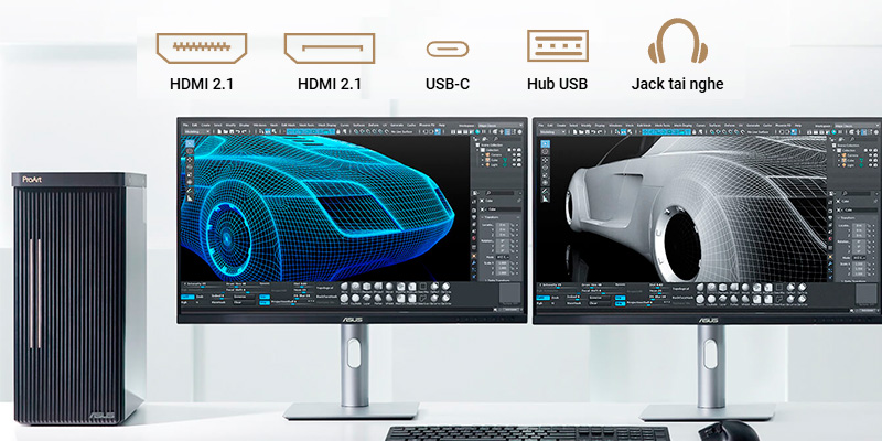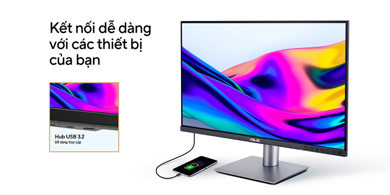 Màn hình trang bị đầy đủ cổng kết nối bao gồm USB-C (96W PD), HDMI 2.1, DisplayPort 1.4, USB Hub 3.2 Gen 1 Type-A & Type-C và KVM Switch – giúp chia sẻ bàn phím/chuột giữa hai thiết bị. Ngoài ra, ASUS Power Sync cho phép khởi động đồng bộ nhiều thiết bị, tạo nên một hệ sinh thái làm việc chuyên nghiệp và hiệu quả hơn bao giờ hết.