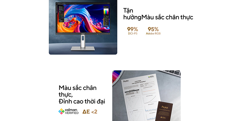 Với 100% sRGB, 99% DCI-P3 và 95% AdobeRGB, chiếc màn hình này mang đến khả năng tái tạo màu sắc cực kỳ chính xác và sống động. Tích hợp công nghệ ProArt Preset & Palette, màn hình dễ dàng điều chỉnh thông số màu sắc theo chuẩn DICOM, HDR, Rec.709,... phù hợp cho đồ họa, thiết kế in ấn, hậu kỳ phim ảnh. Độ lệch màu cực thấp ∆E < 2 giúp đảm bảo kết quả chính xác với những gì bạn thấy trên màn hình.