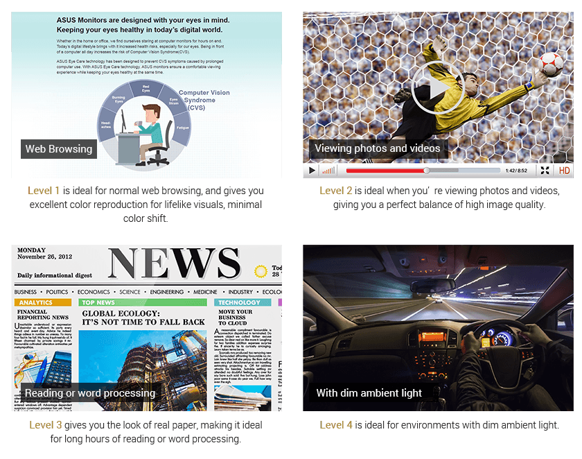 Màn hình ánh sáng xanh siêu thấp Công nghệ Blue Light Filter (Bộ lọc ánh sáng xanh) của ASUS được TÜV Rheinland chứng nhận bảo vệ bạn khỏi ánh sáng xanh có hại và bạn có thể dễ dàng truy cập bốn cài đặt bộ lọc thông qua một phím nóng. |