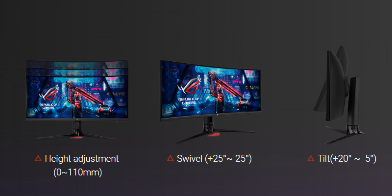 Màn hình ASUS ROG Strix XG309CM được thiết kế theo nguyên tắc công thái học, màn hình này có thể nghiêng, xoay và điều chỉnh độ cao để bạn có thể dễ dàng tìm được góc xem lý tưởng cho riêng mình. Màn hình cũng tương thích chuẩn VESA để treo tường.