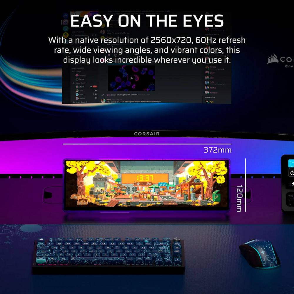 Với kích thước tổng thể chỉ 372 x 120 x 22mm, màn hình cảm ứng Corsair XENEON EDGE LCD 14.5 inch UWHD 60Hz Atomic Purple vô cùng mỏng nhẹ và hoàn toàn không gây vướng víu cho góc setup của bạn. Thiết kế thanh thoát với viền màn hình được tối ưu tốt giúp thiết bị nằm gọn gàng ngay bên dưới chiếc màn hình chính (Main Monitor) trên bàn làm việc, hoặc lọt thỏm một cách tinh tế bên trong khoang nội thất của vỏ case PC.