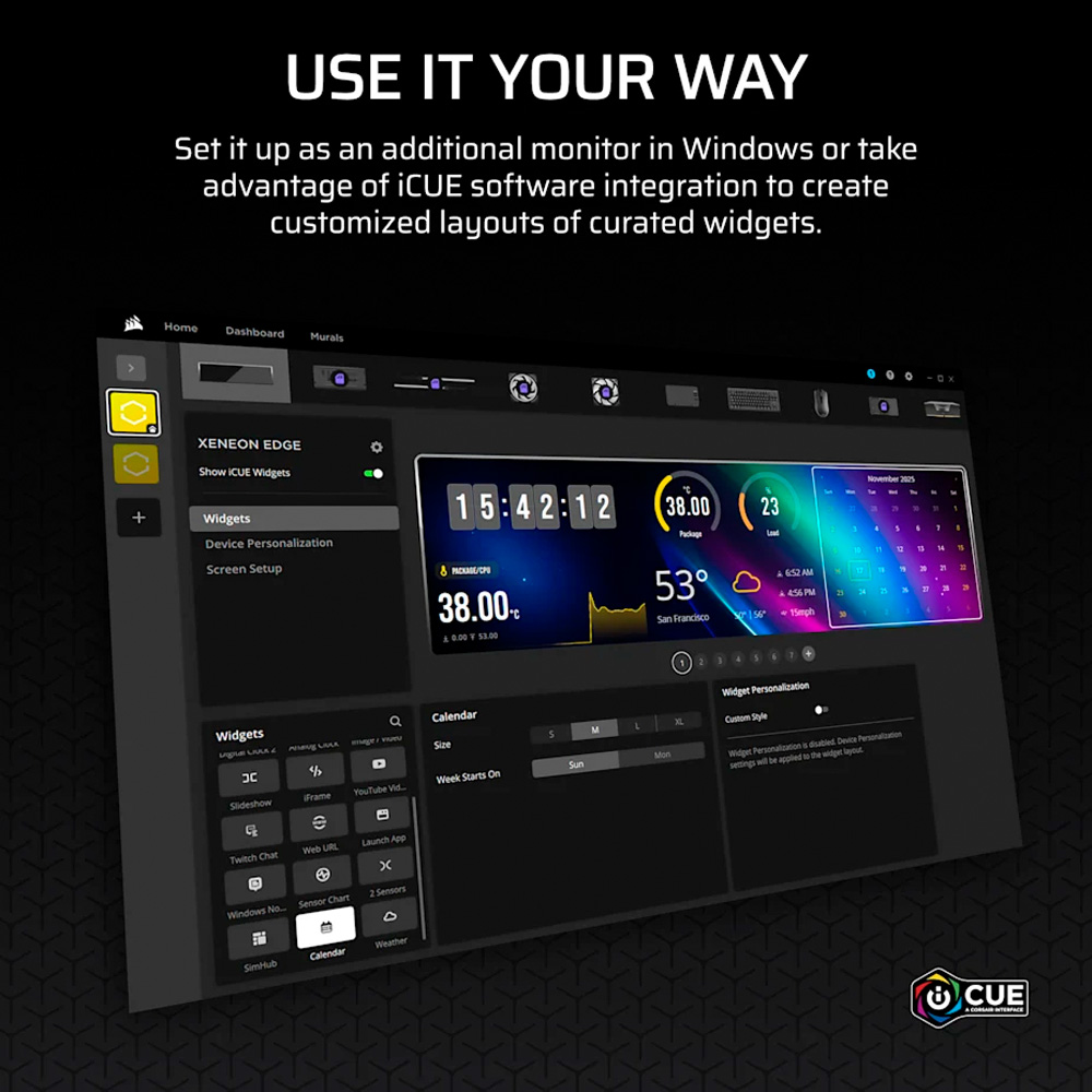 Để hỗ trợ người dùng ngay từ lúc mở hộp, bộ phụ kiện đi kèm đã bao gồm đầy đủ: cáp HDMI to DP, cáp USB-C to C và cáp USB nội bộ. Tuyệt vời hơn, sức mạnh thực sự của XENEON EDGE được giải phóng thông qua hệ sinh thái phần mềm Corsair iCUE. Bạn có thể kéo thả các widget độc quyền, biến chiếc màn hình cảm ứng này thành một trung tâm điều khiển (Control Center) để giám sát nhiệt độ hệ thống, chỉnh LED hay thao tác phím Macro chỉ với một cú chạm.