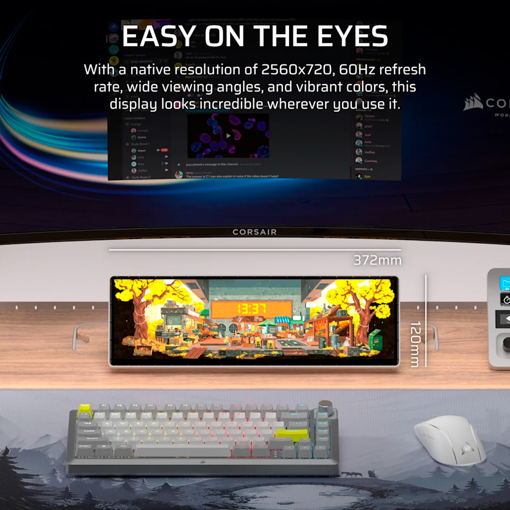 Đừng để kích thước nhỏ gọn đánh lừa, Corsair đã trang bị cho chiếc màn hình phụ này tấm nền AHVA (có chất lượng tương đương IPS) mang lại góc nhìn cực kỳ rộng và màu sắc trung thực từ mọi hướng. Màn hình duy trì tần số quét 60Hz tiêu chuẩn cùng khả năng hiển thị 16.7 triệu màu (8-bit RGB) và độ sáng đạt 350 nits. Những thông số này đảm bảo các hình ảnh, video nền hay các widget thông số kỹ thuật luôn được tái hiện một cách rực rỡ, sắc nét ngay cả trong không gian phòng có nhiều ánh sáng, biến góc máy của bạn trở nên chuyên nghiệp và sống động hơn.