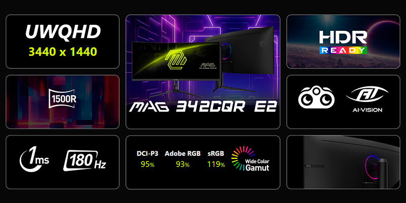 Màn hình cong 2K MSI MAG 342CQR E2 VA 34 inch WQHD 180Hz Curve 1500R có kích thước 34 inch, độ phân giải UWQHD 3440x1440 tỉ lệ 21:9 mang lại không gian hiển thị lớn hơn 33% so với màn hình 16:9 thông thường. Nhờ vùng hiển thị rộng, người dùng có thể mở đồng thời nhiều cửa sổ làm việc, dựng timeline dài hơn, mở bảng điều khiển phụ khi stream hoặc tận hưởng trải nghiệm chơi game nhập vai cực kỳ chân thực.