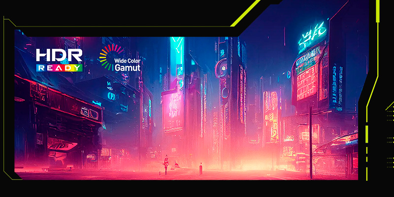 Màn hình hỗ trợ công nghệ AMD FreeSync™ Premium giúp đồng bộ tần số quét với GPU, loại bỏ hoàn toàn hiện tượng xé hình và giật khung. Cùng với đó, khả năng hiển thị HDR Ready giúp hiển thị vùng sáng tối tốt hơn, hỗ trợ hình ảnh HDR chân thực hơn trong các game hoặc nội dung video.