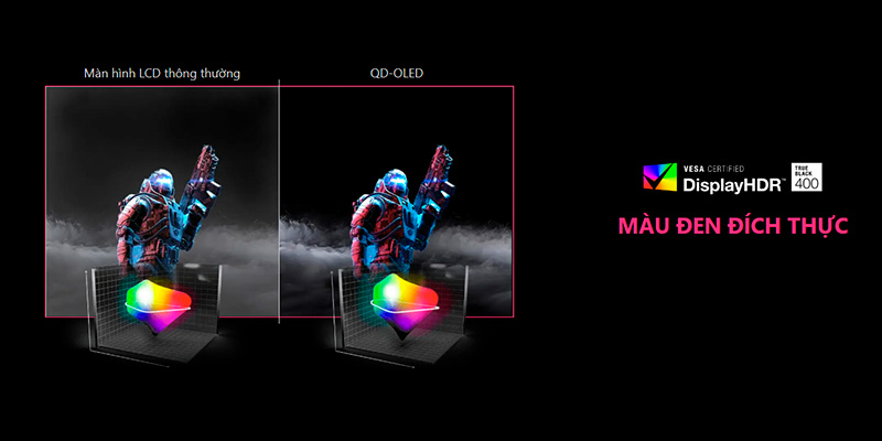 Màn hình này đạt chứng nhận VESA DisplayHDR True Black 400, cung cấp độ sáng tối đa lên đến 1000 nits và độ tương phản 1.5 triệu:1, mang lại hình ảnh với màu đen sâu thẳm và chi tiết rõ ràng trong cả vùng sáng lẫn vùng tối. Điều này đặc biệt quan trọng đối với các nội dung HDR, giúp tái hiện hình ảnh chân thực và sống động hơn bao giờ hết.