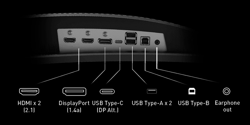 Màn hình được trang bị các cổng kết nối hiện đại bao gồm 2 cổng HDMI 2.1, 1 cổng DisplayPort 1.4a và 1 cổng USB-C hỗ trợ DisplayPort Alt Mode cùng công suất sạc lên đến 98W. Ngoài ra, còn có 2 cổng USB 2.0 Type-A, 1 cổng USB 2.0 Type-B và jack cắm tai nghe 3.5mm, đáp ứng đầy đủ nhu cầu kết nối với các thiết bị ngoại vi.
