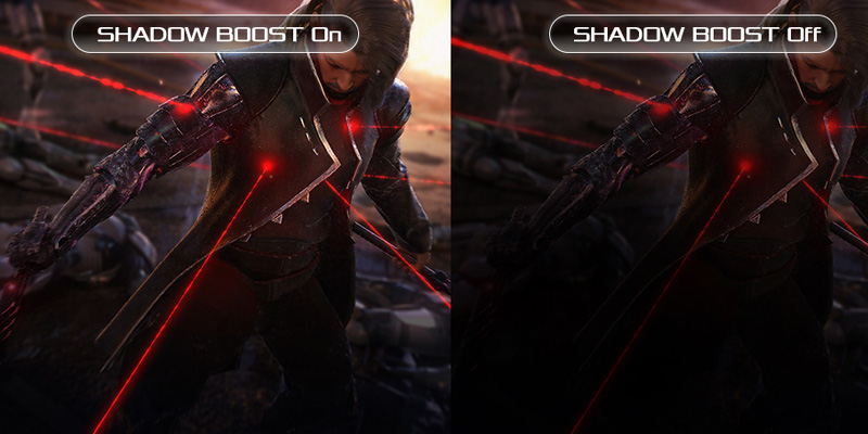 Công nghệ ASUS Shadow Boost làm rõ các vùng tối của thế giới game mà không gây cháy sáng các vùng sáng hơn, điều này cải thiện được trải nghiệm xem tổng thể đồng thời giúp dễ phát hiện được kẻ địch ẩn nấp trong các vùng tối của bản đồ.
