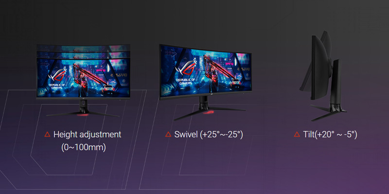 Màn hình cong ASUS ROG Strix XG349C được thiết kế theo nguyên tắc công thái học, màn hình này có thể nghiêng, xoay và điều chỉnh độ cao để bạn có thể dễ dàng tìm được góc xem lý tưởng cho riêng mình. Màn hình cũng tương thích chuẩn VESA để treo tường.