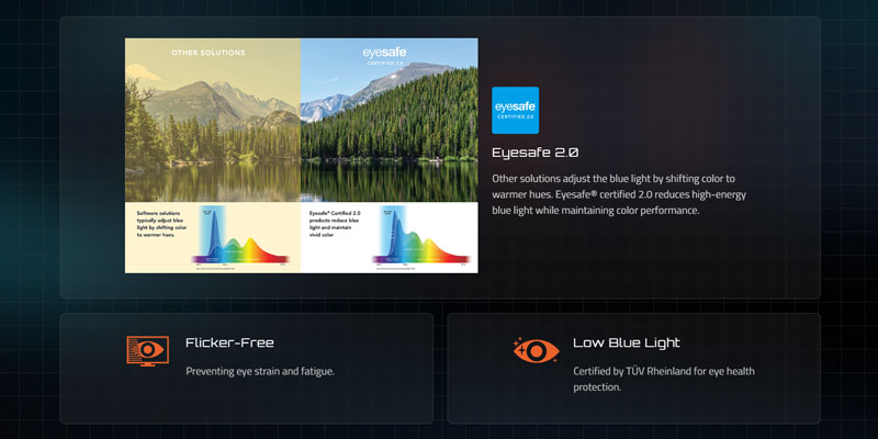 Sử dụng công nghê flicker-free và Eyesafe® được chứng nhận bởi hiệp hội TÜV Rheinland để đáp ứng tiêu chuẩn về cân bằng màu sắc và giảm ánh sáng xanh giúp bảo vệ đôi mắt của bạn. Ngoài ra, GS27FC còn đạt chứng nhận Eyesafe 2.0 giúp giảm màu xanh năng lượng cao ánh sáng trong khi duy trì hiệu suất màu sắc.