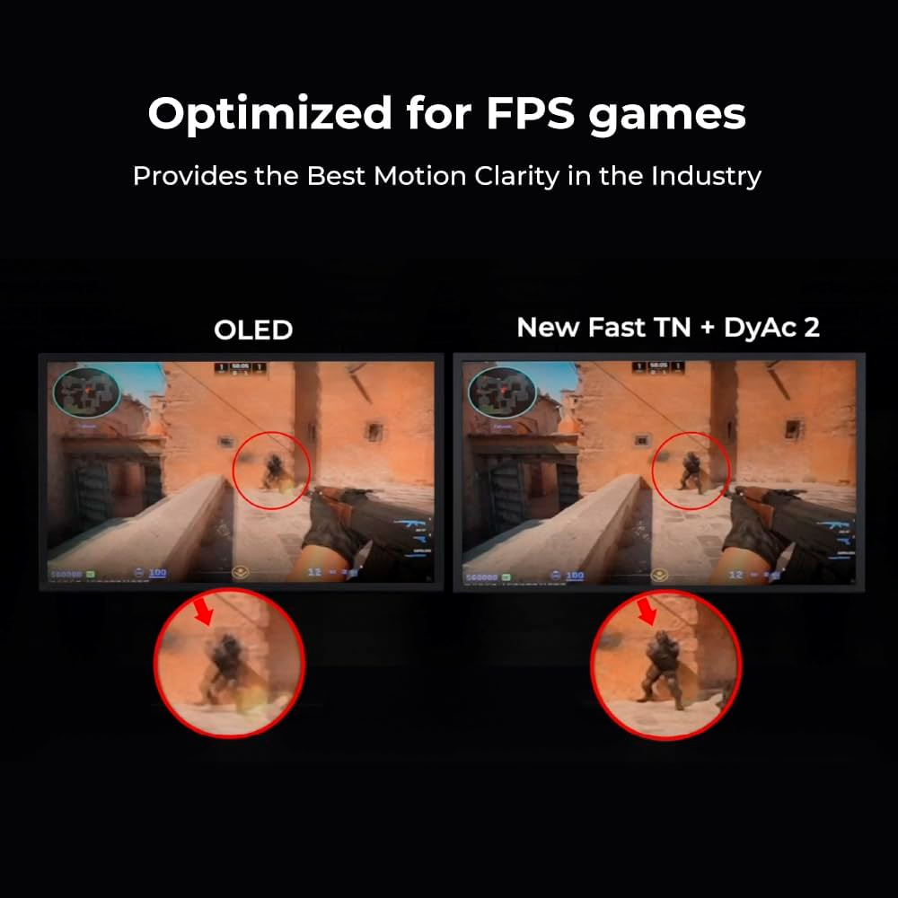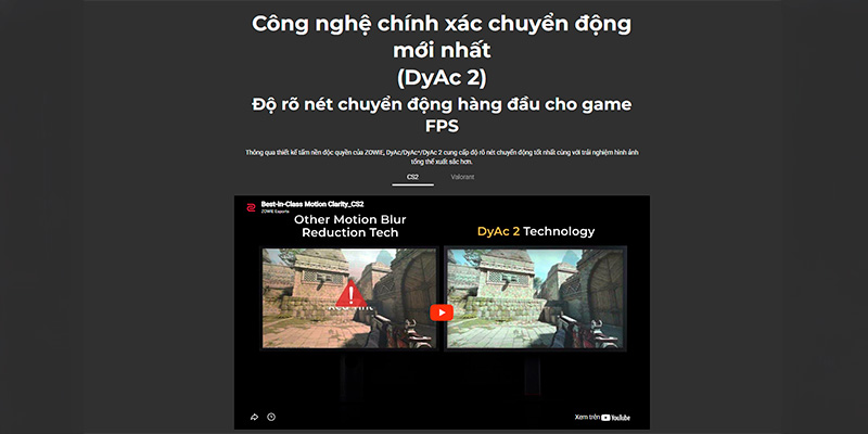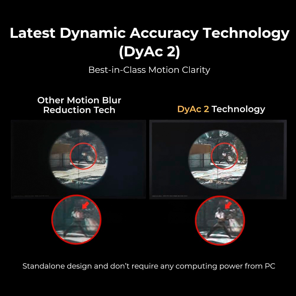 Sự khác biệt làm nên tên tuổi của ZOWIE chính là công nghệ DyAc 2 (Dynamic Accuracy 2) thế hệ mới. Bằng cơ chế kiểm soát đèn nền thông minh, DyAc 2 làm giảm thiểu tối đa hiện tượng nhòe hình (motion blur) trong các pha hành động tốc độ cao. Khi bạn thực hiện những cú vẩy chuột (flick) hay sấy đạn (spray) liên tục, hình ảnh hồng tâm và mục tiêu vẫn hiển thị sắc nét đến từng chi tiết, giúp mắt bạn dễ dàng theo dõi quỹ đạo đạn và kiểm soát độ giật vũ khí một cách chính xác nhất.