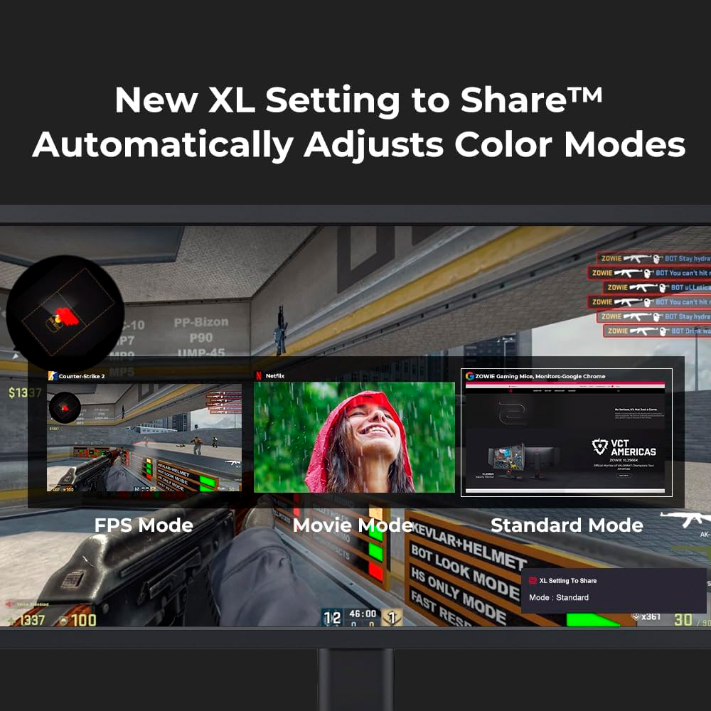 Màn hình được tích hợp tính năng XL Setting to Share™ với Auto Game Mode. Đây là một phần mềm cực kỳ thông minh cho phép tự động nhận diện và chuyển đổi chế độ màu sắc màn hình sao cho phù hợp với tựa game bạn đang mở mà không cần phải chỉnh tay thủ công. Bên cạnh đó, các tính năng "trấn phái" như Black eQualizer (làm sáng các vùng tối mù mịt để phát hiện kẻ địch nấp trong góc) và Low Blue Light (giảm ánh sáng xanh bảo vệ mắt) tiếp tục được duy trì, mang lại lợi thế chiến thuật to lớn trong các pha giao tranh.