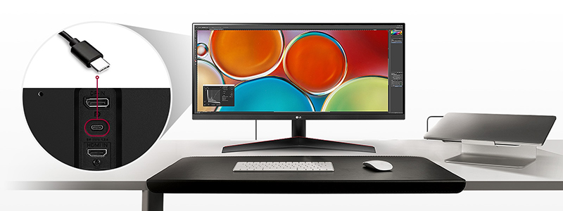 Kết nối USB-C Màn hình LG UltraWide 29 Inch trang bị cổng USB Type-C™ hỗ trợ DisplayPort Chế độ mới. Chỉ cần sử dụng một cáp USB Type-C, toàn bộ tín hiệu hình ảnh DisplayPort có thể được truyền sang màn hình bên ngoài mà không cần cáp màn hình chuyên dụng hoặc bộ chuyển đổi nào. |