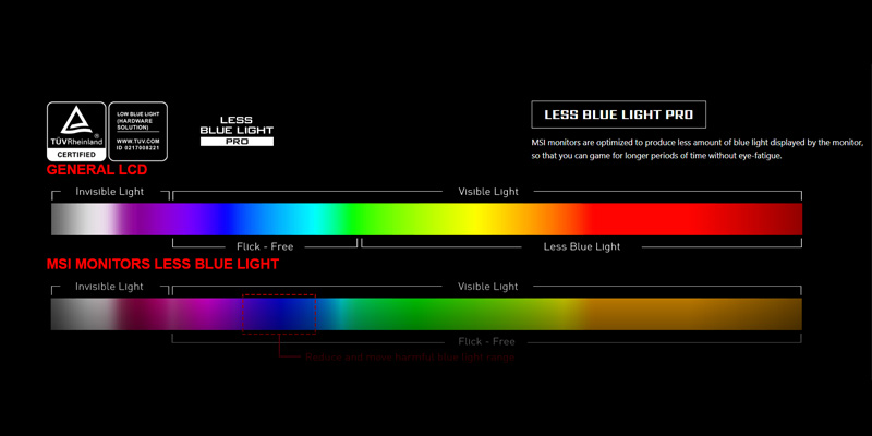 Màn hình MSI G274QRFW được tối ưu hóa để giảm ánh sáng xanh, cho phép bạn chơi game trong thời gian dài mà không bị mỏi mắt.