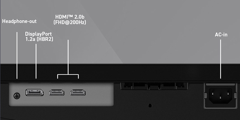 Màn hình được trang bị 2 cổng HDMI 2.0b, 1 DisplayPort 1.2a (HBR2), 1 jack tai nghe 3.5mm và khóa Kensington. Cả hai giao thức HDMI và DP đều hỗ trợ Full HD ở 200Hz, tương thích hoàn hảo với PC, laptop và các thiết bị chơi game console như PS5 và Xbox, hỗ trợ VRR và HDMI CEC để điều khiển đồng bộ tiện lợi hơn.