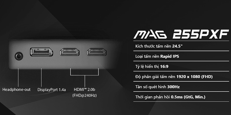 MSI MAG 255PXF tích hợp 1 cổng DisplayPort 1.4a (FHD@300Hz) và 2 cổng HDMI 2.0b (FHD@240Hz), đáp ứng tốt mọi nhu cầu kết nối từ PC, laptop đến máy chơi game như PlayStation hay Xbox. Ngoài ra còn có 1 jack tai nghe 3.5mm và khoá Kensington tăng cường bảo mật vật lý cho thiết bị. Tương thích chuẩn VESA 100x100mm, dễ dàng treo tường hoặc gắn lên arm để setup chuyên nghiệp hơn.