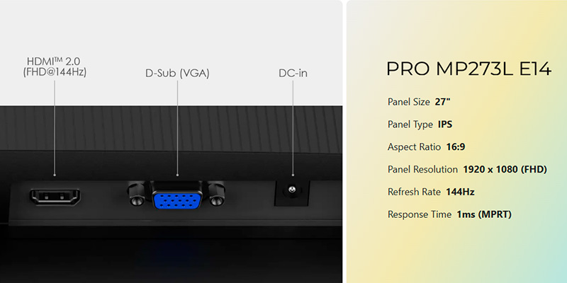 MSI PRO MP273L E14 sở hữu tần số quét 144Hz cùng thời gian phản hồi 1ms (MPRT) / 4ms (GtG), giúp giảm thiểu hiện tượng xé hình và bóng mờ. Công nghệ AMD FreeSync đảm bảo trải nghiệm chơi game mượt mà, loại bỏ tình trạng giật hình và trễ khung hình. Đây là lựa chọn tuyệt vời cho game thủ yêu thích tựa game hành động, FPS hoặc eSports.