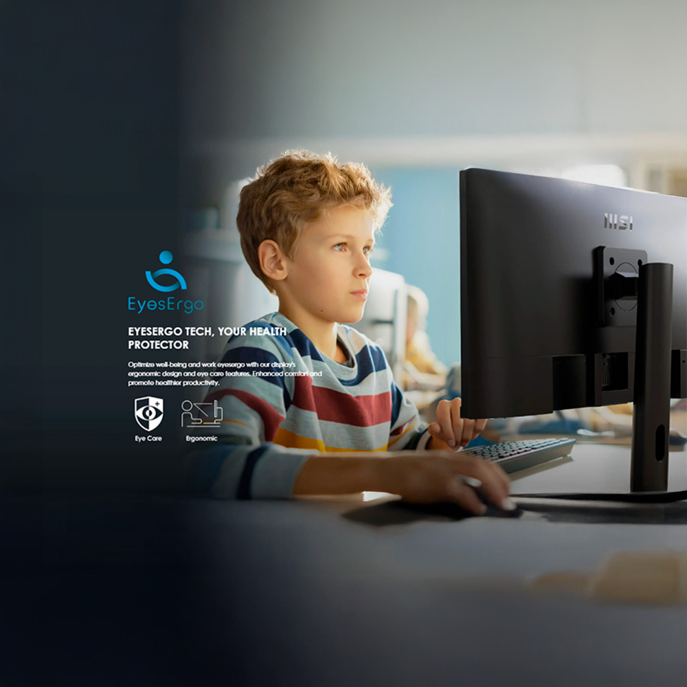 Làm việc liên tục trước màn hình độ phân giải cao có thể gây mỏi mắt, thấu hiểu điều này, MSI đã trang bị công nghệ bảo vệ thị lực EyesErgo tiên tiến. Hệ thống bao gồm công nghệ chống nháy hình (Anti-Flicker) và công nghệ lọc ánh sáng xanh (Less Blue Light) đạt chứng nhận an toàn, giúp giảm căng thẳng cho đôi mắt. Đặc biệt, màn hình còn tích hợp phần mềm Eye-Q Check độc quyền, cho phép bạn tự thực hiện các bài kiểm tra thị lực trực quan ngay trên màn hình, nhắc nhở thời gian nghỉ ngơi và duy trì tư thế ngồi làm việc đúng chuẩn bảo vệ sức khỏe lâu dài.