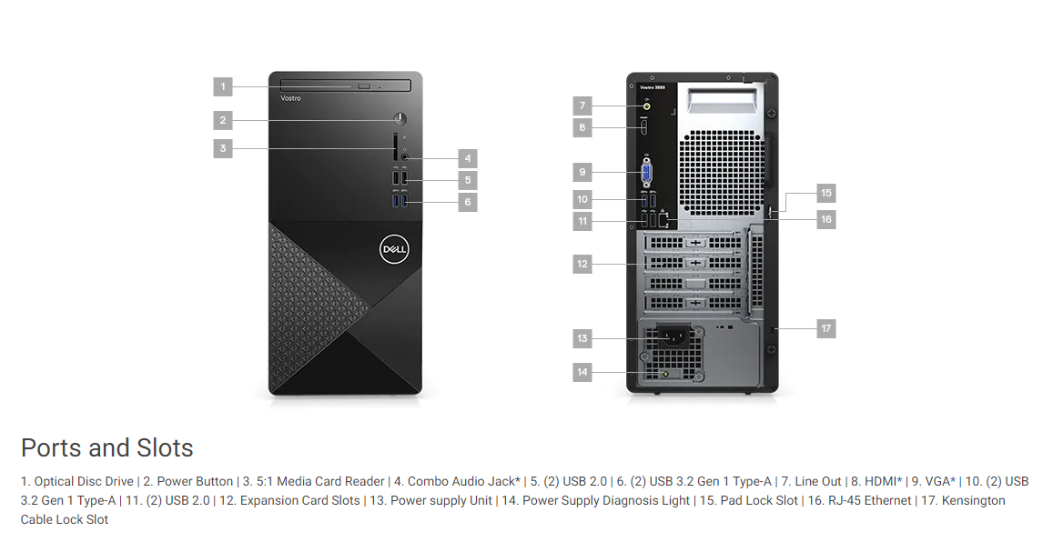 |  | Đa dạng kết nối Máy bộ Dell đa dạng kết nối, bạn có thể xuất hình thông qua cổng VGA hoặc HDMI hoặc kết nối các thiết bị ngoại vi qua cổng USB Type-A. |
