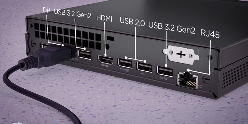 ThinkCentre Neo 50q Gen 4 được trang bị đầy đủ cổng kết nối bao gồm 1 cổng USB-C 3.2 Gen 2 và 1 cổng USB 3.2 Gen 2 ở mặt trước, kèm theo jack combo tai nghe 3.5mm. Phía sau là 2 cổng USB 2.0, 2 cổng USB 3.2 Gen 2, cổng HDMI 2.1 TMDS, DisplayPort 1.4 và cổng LAN RJ-45. Hệ thống cổng giao tiếp này cho phép người dùng kết nối dễ dàng với máy in, máy chiếu, ổ cứng rời, màn hình mở rộng hoặc các thiết bị ngoại vi khác trong văn phòng.