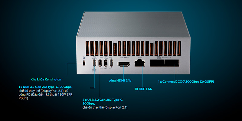 Mini PC AI ASUS Ascent GX10 được trang bị đầy đủ cổng kết nối cao cấp: 3 cổng USB 3.2 Gen 2x2 Type-C 20Gbps ở mặt trước, 1 cổng USB-C hỗ trợ PD in 180W, 1 HDMI 2.1, 1 cổng 10G LAN, và 1 cổng NVIDIA ConnectX-7 SmartNIC ở mặt sau. Kết hợp với Wi-Fi 7 Gig+ và Bluetooth 5, người dùng có thể dễ dàng kết nối mạng tốc độ cao và thiết bị ngoại vi không dây. Nguồn điện cung cấp tối đa 240W qua USB-C PD 3.1 EPR, đảm bảo năng lượng ổn định cho CPU và GPU trong quá trình vận hành nặng.