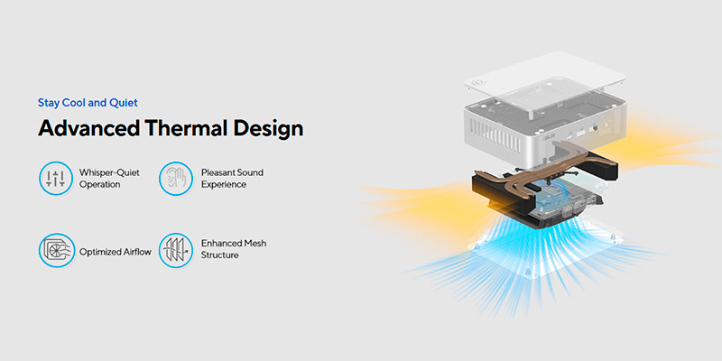 Không chỉ có hiệu năng mạnh mẽ, ASUS NUC 15 Pro Plus RNUC15CRSU700000I còn được tích hợp hệ thống tản nhiệt tối ưu, đảm bảo duy trì nhiệt độ ổn định ngay cả khi chạy đa tác vụ nặng. Quạt hoạt động êm ái, ít gây tiếng ồn, phù hợp với môi trường làm việc yên tĩnh như văn phòng, phòng họp hoặc không gian học tập. Hệ thống cấp nguồn đạt chuẩn và chất lượng linh kiện cao cấp từ ASUS cũng giúp tăng độ bền thiết bị, hỗ trợ vận hành liên tục trong thời gian dài mà không lo hỏng hóc. Sản phẩm còn đạt tiêu chuẩn kiểm tra độ bền khắt khe, sẵn sàng hoạt động ổn định trong các môi trường có yêu cầu khắt khe về độ tin cậy.
