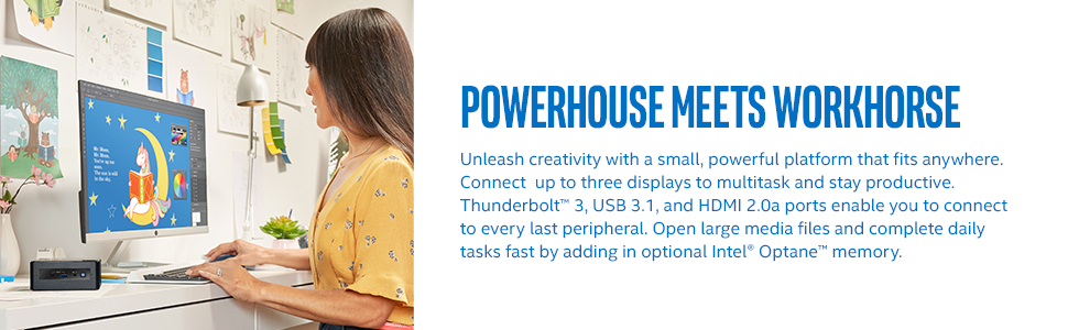 Sẵn sàng cho công việc, học tập và giải trí ở mọi nơi Máy tính Mini PC Intel NUC có thể kết nối lên đến 4 màn hình cùng một lúc và ở bất kỳ đâu. Cho dù bạn kết nối ở đâu, thiết bị vẫn sẽ đáp ứng ngay lập tức các mệnh lệnh của bạn.