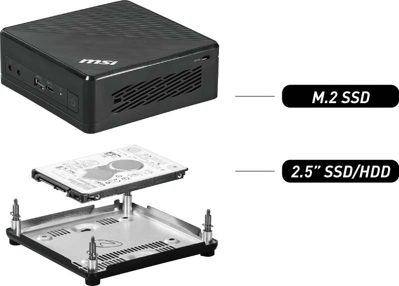 Dễ dàng nâng cấp Máy tính Mini PC MSI Cubi 5 thiết kế đơn giản để dễ dàng nâng cấp, chỉ cần tháo 4 con ốc ở dưới để thay thế SSD M.2, ram hoặc ổ cứng 2.5 inch |