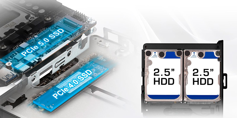 DeskMini X600/USB4 hỗ trợ 1 khe M.2 PCIe Gen5 x4 (128Gb/s) và 1 khe M.2 PCIe Gen4 x4 (64Gb/s), cùng với 2 khay SATA 2.5 inch cho HDD/SSD. Sản phẩm còn hỗ trợ RAID 0 và RAID 1 cho ổ NVMe, đáp ứng nhu cầu vừa tốc độ cao, vừa an toàn dữ liệu. Người dùng có thể xây dựng hệ thống lưu trữ phù hợp cho cả công việc lẫn giải trí. Đây là ưu điểm nổi bật giúp DeskMini X600 trở thành một Mini PC mạnh mẽ hàng đầu.