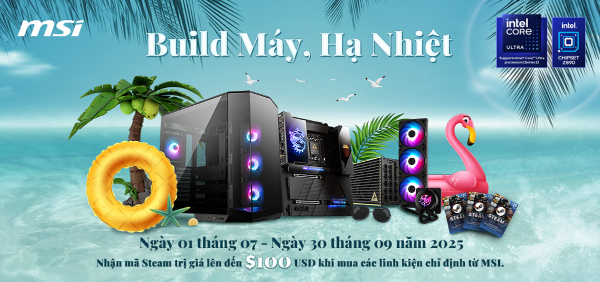 Chương trình “Build Máy, Hạ Nhiệt” diễn ra từ ngày 01/07/2025 đến hết ngày 30/09/2025. Trong khoảng thời gian này, khi bạn mua sắm các linh kiện MSI tại MemoryZone bao gồm bo mạch chủ, tản nhiệt nước, bộ nguồn hoặc case PC được chỉ định, bạn sẽ có cơ hội nhận mã Steam với giá trị từ 10 USD cho tới tận 100 USD.