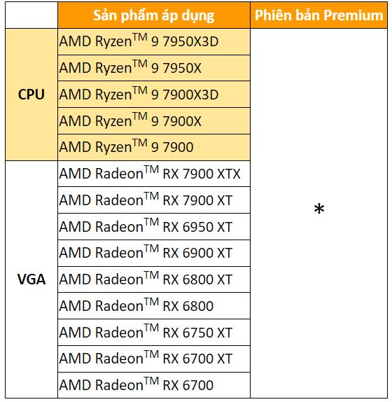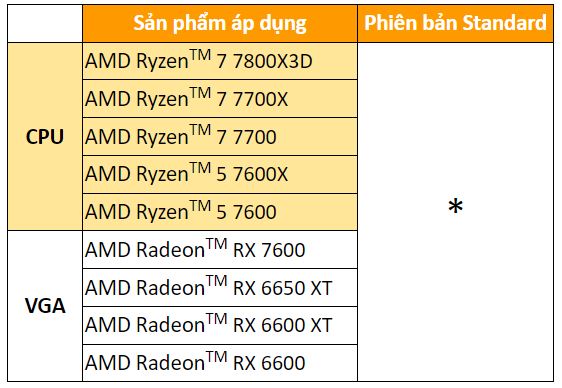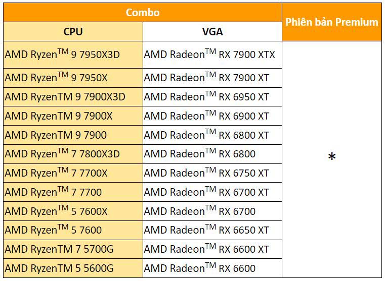Hoặc khi mua combo bất kỳ CPU AMD Ryzen kết hợp với VGA AMD Radeon bất kỳ theo danh sách bên dưới: