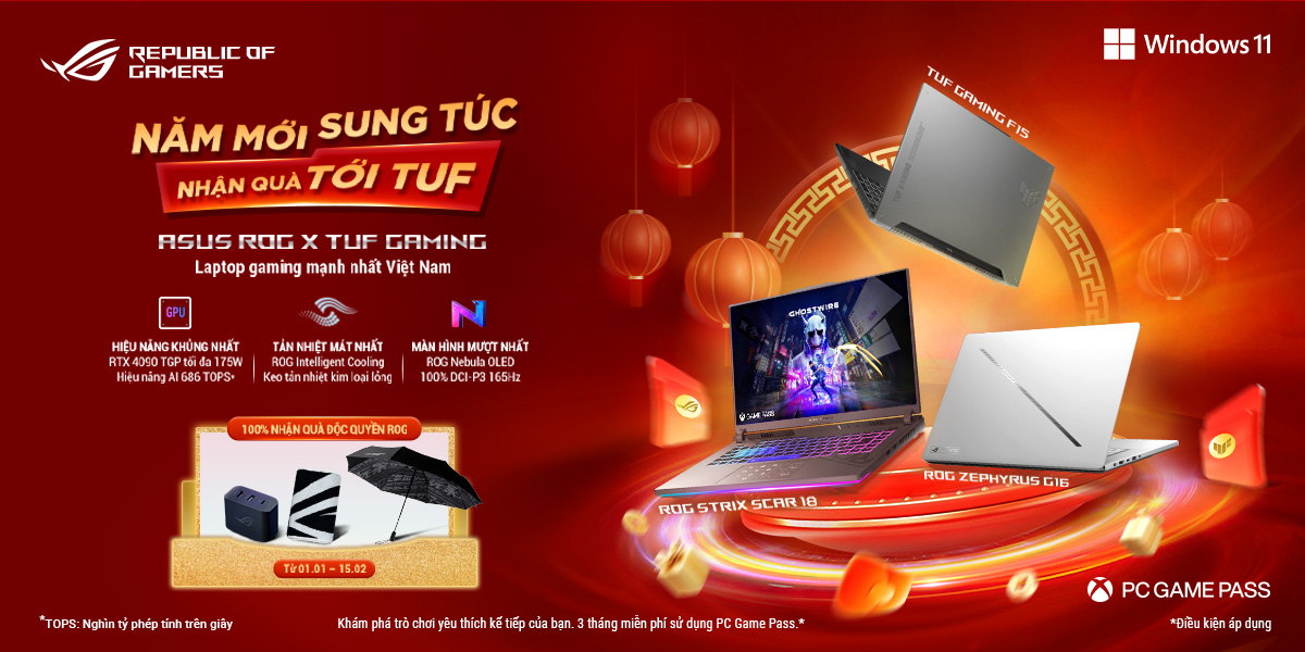 Chào đón một năm mới bùng nổ, Asus TUF mang đến chương trình khuyến mãi "Năm mới sung túc, nhận quà tới TUF" nhằm tri ân các game thủ và khách hàng thân thiết. Mua ngay laptop TUF và nhận những phần quà giá trị trong mùa lễ hội năm nay.