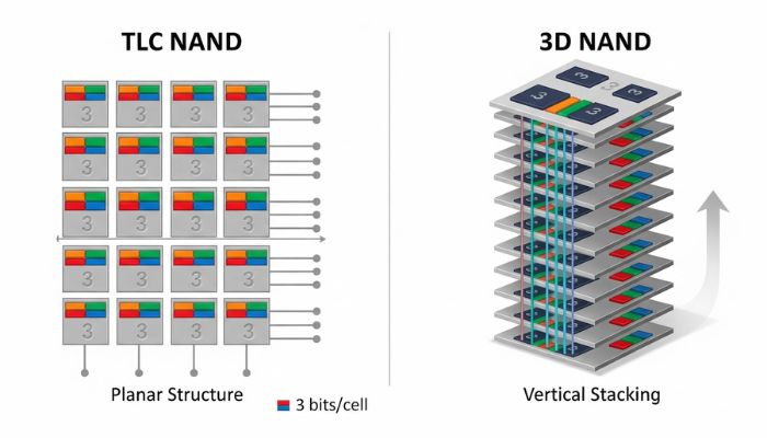 3D NAND flash (còn gọi là V-NAND - Vertical NAND) là cuộc cách mạng lớn nhất trong công nghệ bộ nhớ flash kể từ khi ra đời. Thay vì sắp xếp các ô nhớ theo chiều ngang trên một mặt phẳng như NAND 2D truyền thống (planar NAND), công nghệ 3D NAND xếp chồng nhiều lớp ô nhớ theo chiều dọc, giống như các tầng của một tòa cao ốc.
