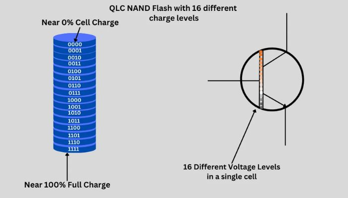 QLC (Quad-Level Cell) đại diện cho thế hệ mới nhất của công nghệ NAND flash, với khả năng lưu trữ 4 bit dữ liệu trên mỗi ô nhớ. Mỗi ô QLC có thể biểu diễn 16 trạng thái điện áp khác nhau, đạt mật độ lưu trữ cao nhất hiện nay và chi phí sản xuất thấp nhất.