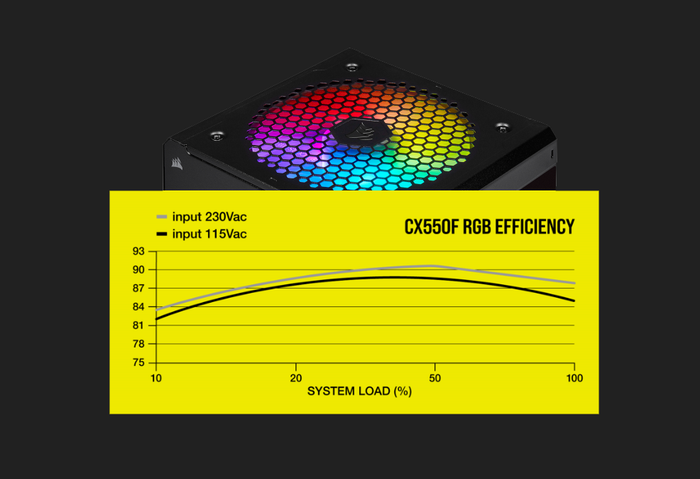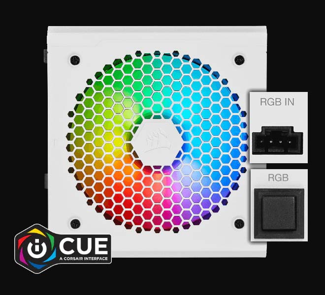Nguồn máy tính Corsair CX550F 550W RGB 80 Plus Bronze Ánh sáng rực rỡ Mỗi PSU CX-F RGB đều có quạt RGB với tám đèn LED RGB có thể tùy chỉnh riêng biệt để cung cấp ánh sáng nổi bật tuyệt đẹp cho bộ máy của bạn. |