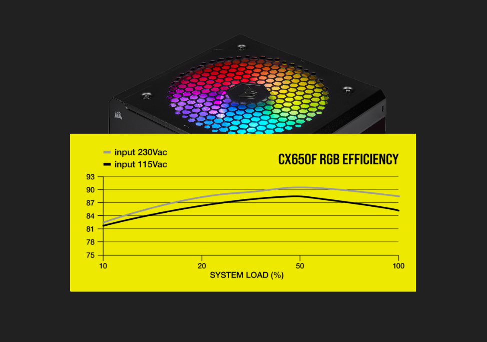Nguồn máy tính Corsair CX650F 650W RGB 80 Plus Bronze Ánh sáng rực rỡ Mỗi PSU CX-F RGB đều có quạt RGB với tám đèn LED RGB có thể tùy chỉnh riêng biệt để cung cấp ánh sáng nổi bật tuyệt đẹp cho bộ máy của bạn. |