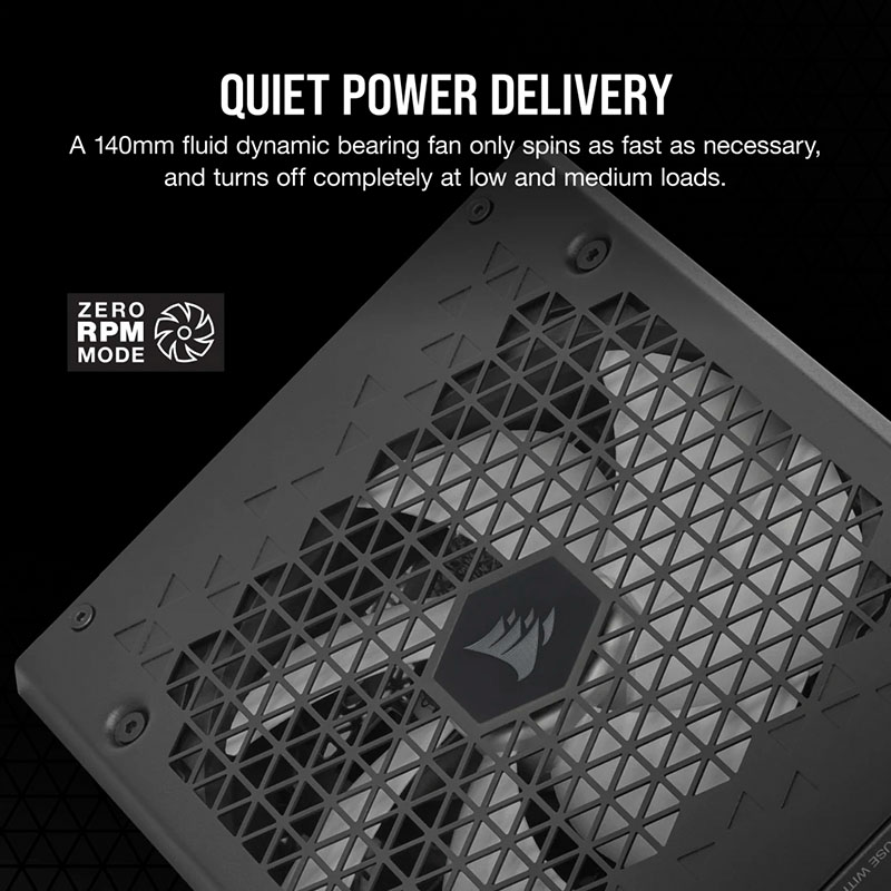 Được trang bị quạt làm mát 140mm FDB (Fluid Dynamic Bearing) hoạt động siêu êm, Corsair HX1200i 2025 ATX 3.1 & PCIe 5.1 1200W giúp duy trì mức nhiệt tối ưu mà không ảnh hưởng đến không gian yên tĩnh của bạn. Đặc biệt, chế độ Zero RPM Fan Mode cho phép quạt ngừng quay hoàn toàn khi tải thấp, loại bỏ hoàn toàn tiếng ồn trong các tác vụ nhẹ nhàng hoặc khi hoạt động ở chế độ nghỉ. Công nghệ tản nhiệt này không chỉ nâng cao tuổi thọ cho các linh kiện bên trong mà còn tạo ra trải nghiệm sử dụng yên tĩnh, dễ chịu, đặc biệt phù hợp với các không gian làm việc sáng tạo hoặc phòng thu cần độ yên tĩnh cao.