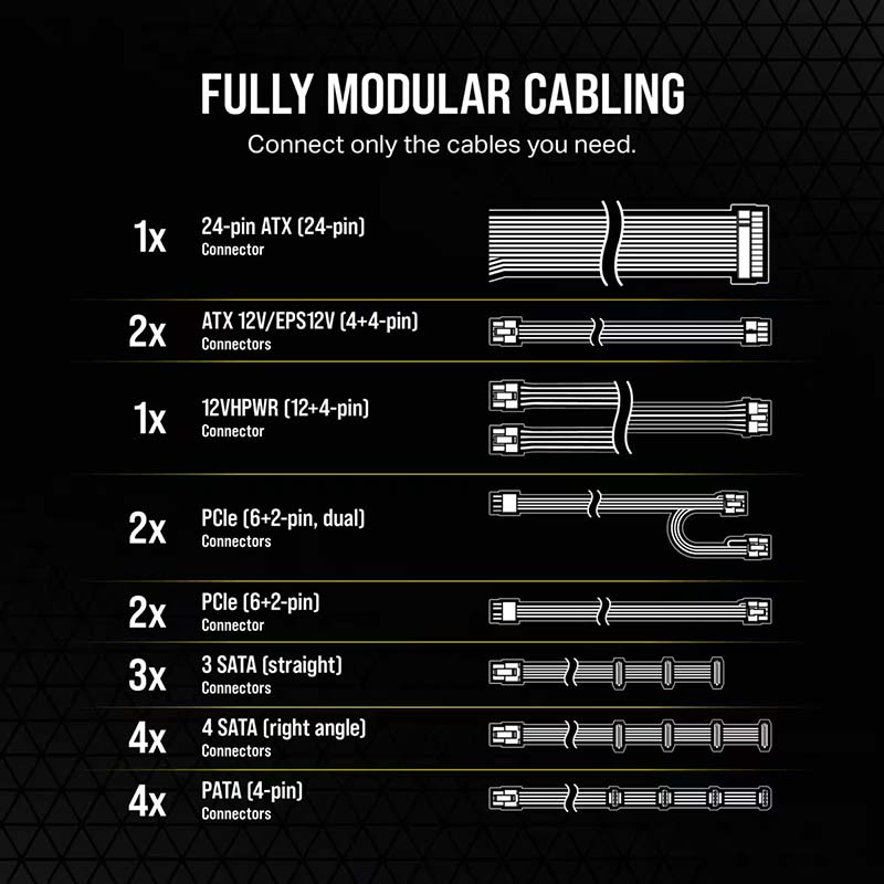 Modul fully Giảm sự lộn xộn của cáp bằng cách chỉ kết nối các cáp mà hệ thống của bạn cần. Năm đầu nối 8-pin dễ dàng đáp ứng mọi nhu cầu về nguồn của bo mạch chủ và GPU hiện đại |